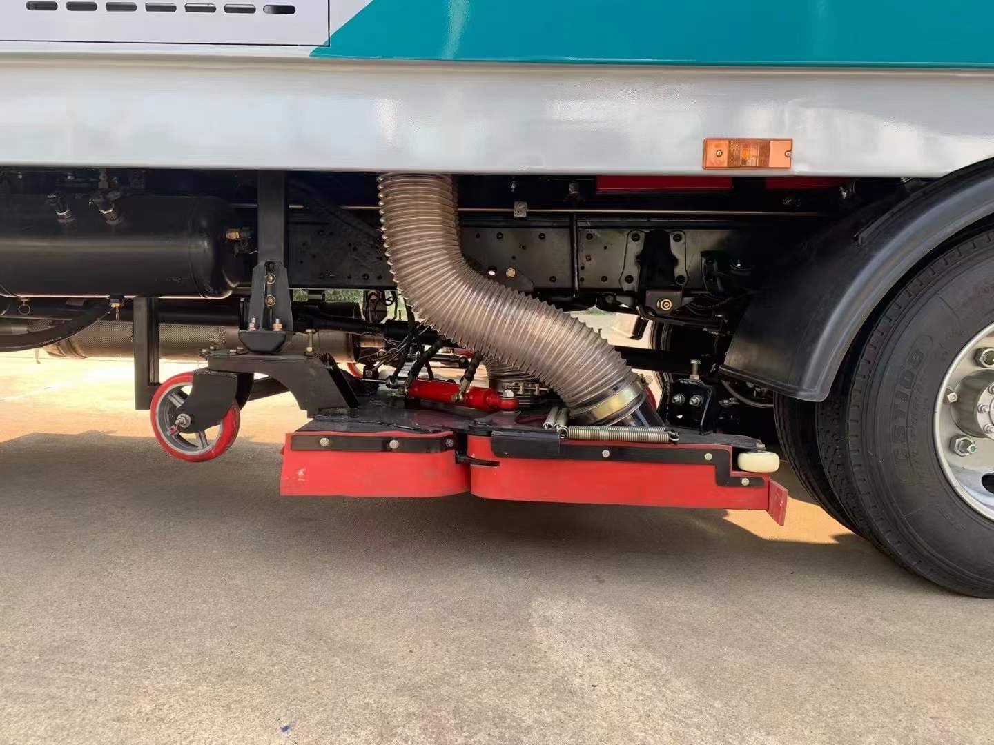 側防護采用Q235,螺栓連接;后防護采用Q235,焊接連接,后防護截面高度尺寸120mm,截面寬度尺寸50mm,下邊緣離地高度360mm;裝液壓制動系統時,ABS及其控制器型號/生產企業對應關系為::APG3550500A/浙江亞太機電股份有限公司,CM4YL/廣州瑞立科密汽車電子股份有限公司;裝氣壓制動系統時,ABS及其控制器型號/生產企業對應關系為:CM4XL-4S/4M/廣州瑞立科密汽車電子股份有限公司;該車專用裝置主要由箱體和吸塵系統組成,用于路面吸塵作業.